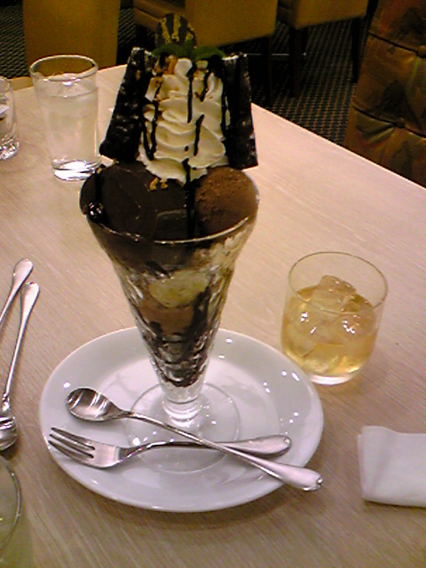 その帰り、ファミレスでチョコパフェ&シーバスリーガル(酒)のダブル。